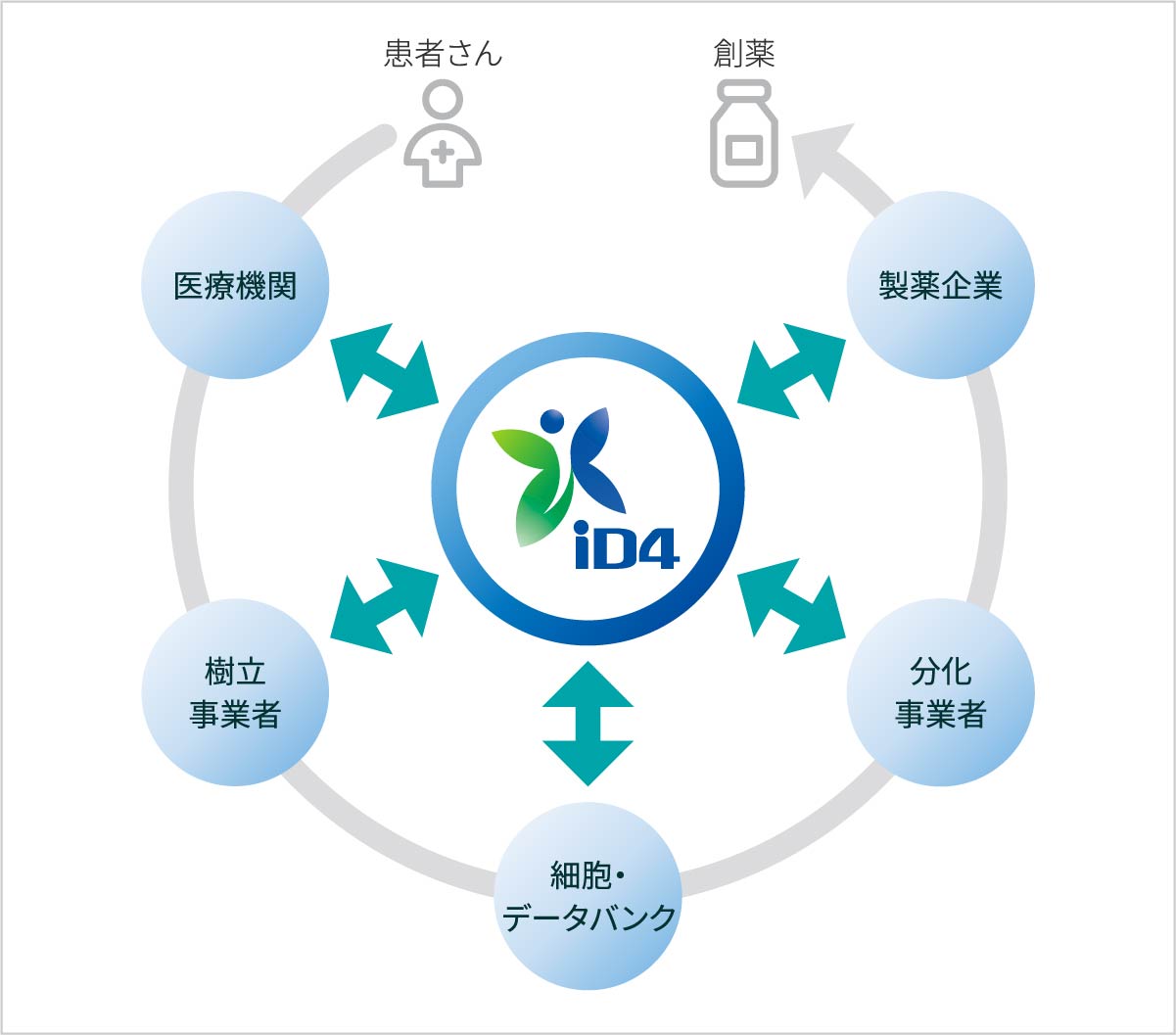 iD4は、患者由来のiPS細胞を適切な同意と臨床情報に基づきコントロールされた品質で提供し、製薬企業や研究機関の創薬研究を加速するプラットフォームです。